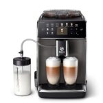 Coffee type Beans | Coffee machine features Double cup dispense/Cappuccino maker/Coffee grinding/Adjustable grinding/Removable drip tray/Removable used coffee compartment/Automatic rinsing/Automatic descaling/Display | Water capacity 1.8L | Control type Sensory | Power consumption 1500 Watts | Colour Black | Product Net Weight 7.2 kg