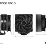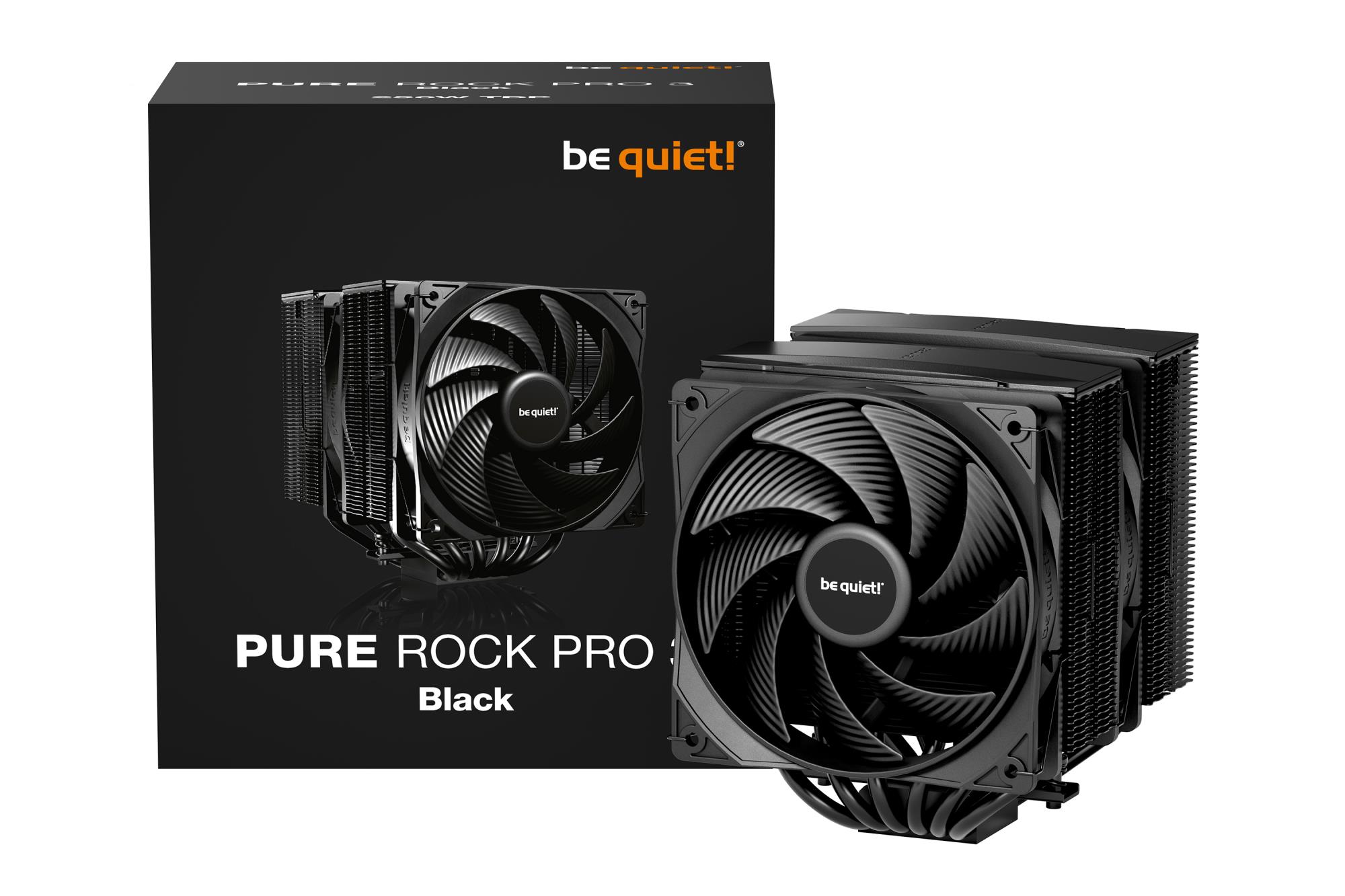 Model name Pure Rock Pro 3 Black | 120 mm | Type Air cooler | Supported processor sockets LGA 1150 (Socket H3)/LGA 1151 (Socket H4)/LGA 1155 (Socket H2)/LGA 1200 (Socket H5)/LGA 1700/LGA 1851/Socket AM4/Socket AM5 | Suitable location Processor | Rotational speed (max) 2000 RPM | Noise level (high speed) 34.8 dB | Maximum airflow 59.6 cfm | Airflow 101.2 m³/h | Pulse-width modulation (PWM) support Yes | Bearing type Rifle bearing | Colour Black | Base plate material Copper | Number of fans 2 fan(s) | Fins material Aluminium | 6xNumber of heat pipes | Fan connector 4-pin | Thermal Design Power (TDP) 250 W | Radiator height 155 mm | Weight 1.07 kg | Mounting kit Yes