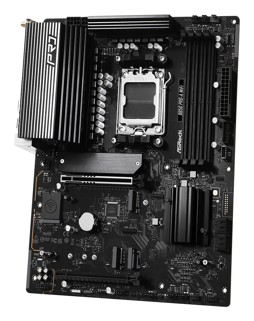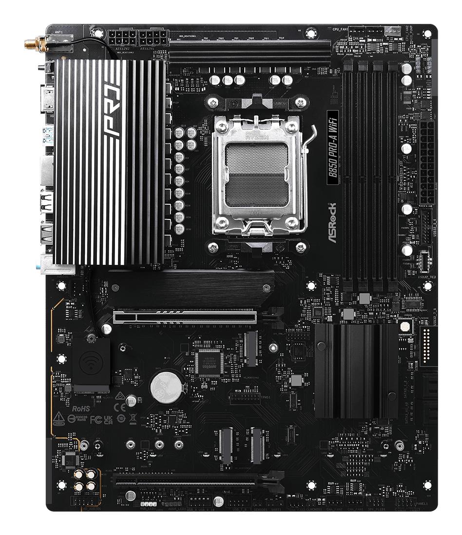 AMD B850 | ATX | Audio 7.1 channels | CPU AMD | Socket Socket AM5 | Series AMD Ryzen 7000 Series/AMD Ryzen 8000 Series/AMD Ryzen 9000 Series | Supported memory types DDR5-SDRAM | 4xNumber of memory slots | Memory slots type DIMM | Supported storage drive interfaces PCI Express 4.0,PCI Express 5.0,SATA III | 3840 x 2160 pixels | 6xUSB 2.0 ports quantity | 4xUSB 3.2 Gen 1 (3.1 Gen 1) Type-A ports quantity | 1xUSB 3.2 Gen 1 (3.1 Gen 1) Type-C ports quantity | 1xUSB 3.2 Gen 2 (3.1 Gen 2) Type-C ports quantity | 1xEthernet LAN (RJ-45) ports | 1xHDMI ports quantity | Wi-Fi Yes | Bluetooth Yes | Antenna included Yes