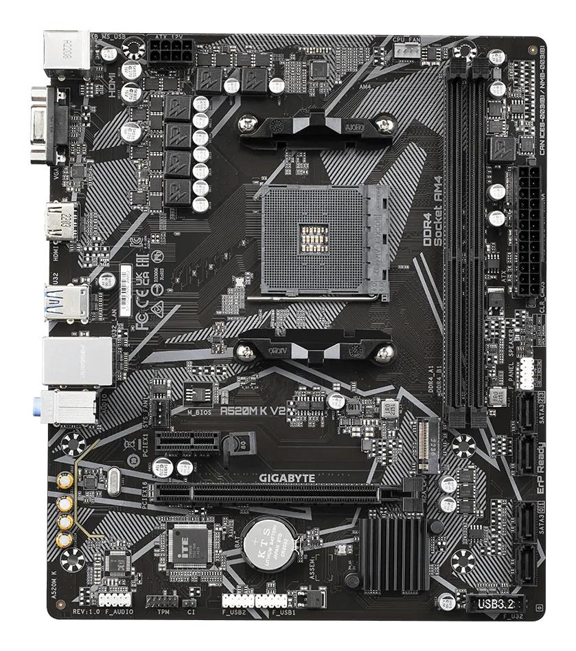 AMD A520 | micro ATX | Audio 7.1 channels | CPU AMD | Socket Socket AM4 | Series AMD Ryzen 3000 Series/AMD Ryzen 5000 Series | Supported memory types DDR4-SDRAM | 2xNumber of memory slots | Memory slots type DIMM | Supported storage drive interfaces M.2,SATA III | 4096 x 2160 pixels | 2xUSB 2.0 ports quantity | 4xUSB 3.2 Gen 1 (3.1 Gen 1) Type-A ports quantity | 1xEthernet LAN (RJ-45) ports | 1xVGA (D-Sub) ports quantity | 1xHDMI ports quantity