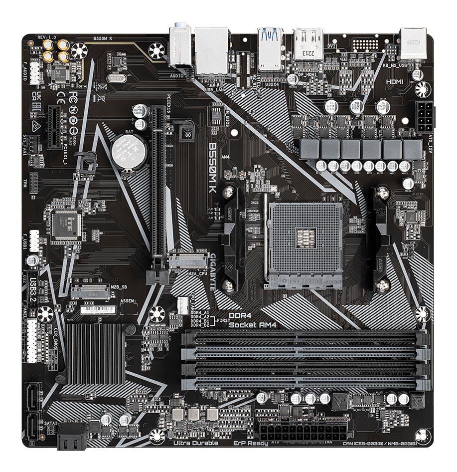 AMD B550 | micro ATX | Audio 7.1 channels | CPU AMD | Socket Socket AM4 | Series AMD Ryzen 3000 Series/AMD Ryzen 4000 Series/AMD Ryzen 5000 Series | Supported memory types DDR4-SDRAM | 4xNumber of memory slots | Memory slots type DIMM | Supported storage drive interfaces M.2,SATA | 5120 x 2880 pixels | 4xUSB 2.0 ports quantity | 4xUSB 3.2 Gen 1 (3.1 Gen 1) Type-A ports quantity | 1xEthernet LAN (RJ-45) ports | 1xHDMI ports quantity