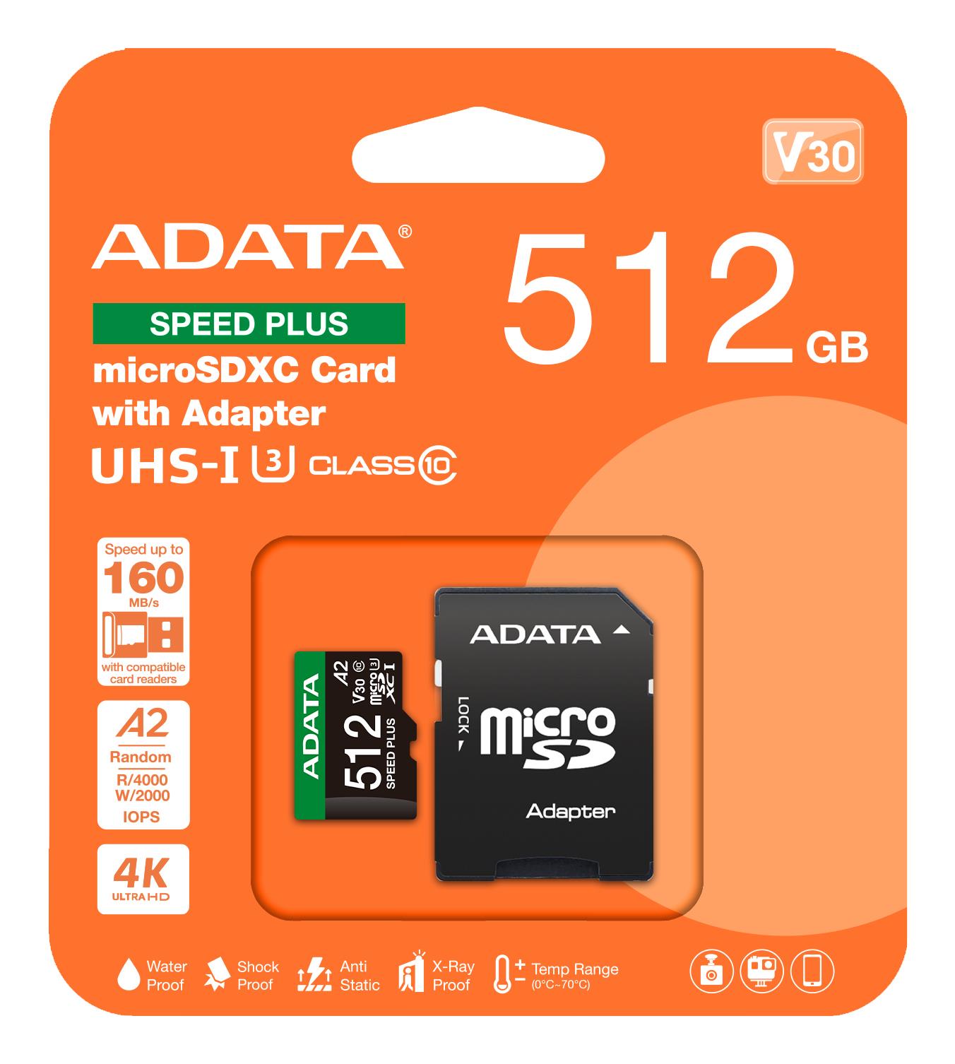 512 GB | Type MicroSDXC | Read speed 180 MB/s | Write speed 160 MB/s | UHS Speed Class Class 3 (U3) | Video Speed Class V30 | Flash memory class Class 10 | Colour Black/White/Green | Operating temperature (T-T) 0 – 70 °C | Width 15 mm | Depth 1 mm | Height 11 mm | Memory adapter included SD