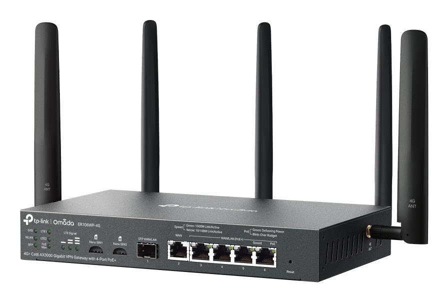 ER706WP-4G | Dual-band (2.4 GHz / 5 GHz) | WLAN data transfer rate (max) 300 Mbit/s | Ethernet WAN Yes | DSL WAN Yes | SIM card slot Yes | 3G/4G USB modem compatibility Yes | Ethernet LAN Yes | Ethernet LAN interface type Gigabit Ethernet | Mobile network generation 4G | Dual SIM support Yes | SIM card type NanoSIM | 5xEthernet LAN (RJ-45) ports | USB port Yes | Antenna design External | Power source type DC,PoE | Operating temperature (T-T) 0 – 40 °C