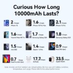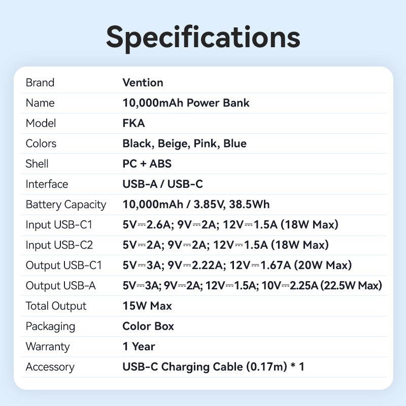 Capacity 10000 mAh | Battery capacity 38.5 Wh | Fast charging Yes | 2xNumber of simultaneously connected devices (max) | Colour Blue | Housing material Polycarbonate (PC),ABS | Charger compatibility Universal | Built-in display Yes | Input interface USB Type-C | Output voltage 5/9/12 V | Weight 198 g | Cables included USB Type-C | Product Net Weight 0.155 kg