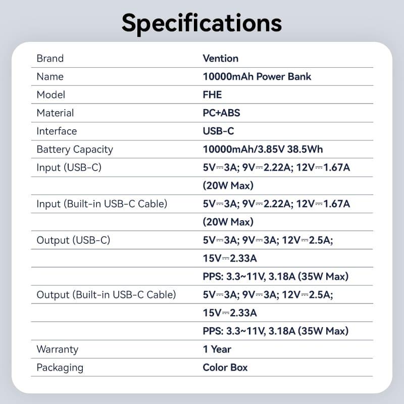 Lithium Polymer (LiPo) | Capacity 10000 mAh | Battery capacity 38.5 Wh | Fast charging Yes | 2xNumber of simultaneously connected devices (max) | Colour White | Charger compatibility Universal | Built-in display Yes | Input interface USB Type-C | Total output power 35 W