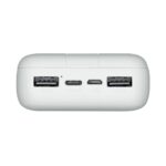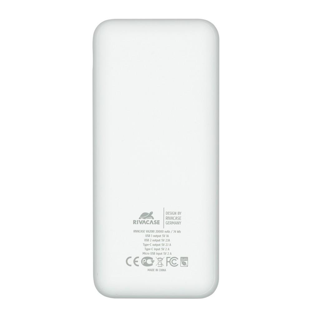 Lithium Polymer (LiPo) | Capacity 20000 mAh | Battery capacity 74 Wh | 3xNumber of simultaneously connected devices (max) | Colour White | Charger compatibility Mobile phone/Smartphone,Tablet | Input interface Micro-USB + USB Type-C | Total output power 10 W | Output voltage 5 V | Weight 380 g | Cables included Micro-USB | Product Net Weight 0.38 kg