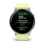 Venu 4 | AMOLED | 3.56 cm (1.4″) | Display type Digital | Display resolution 454 x 454 pixels | Touchscreen Yes | Watch glass type Corning Gorilla Glass 3 | Flash memory 8 GB | Band material Silicone | Shape Round | Market positioning Smartwatch | Watch case size 45 mm | Watch case colour Silver | Watch case material Polymer,Stainless steel | Heart rate monitor Yes | Wi-Fi Yes | Battery type Built-in battery | Battery technology Lithium-Ion (Li-Ion) | Battery life (max) 600 h | Battery life 12 day(s) | Weight 38 g